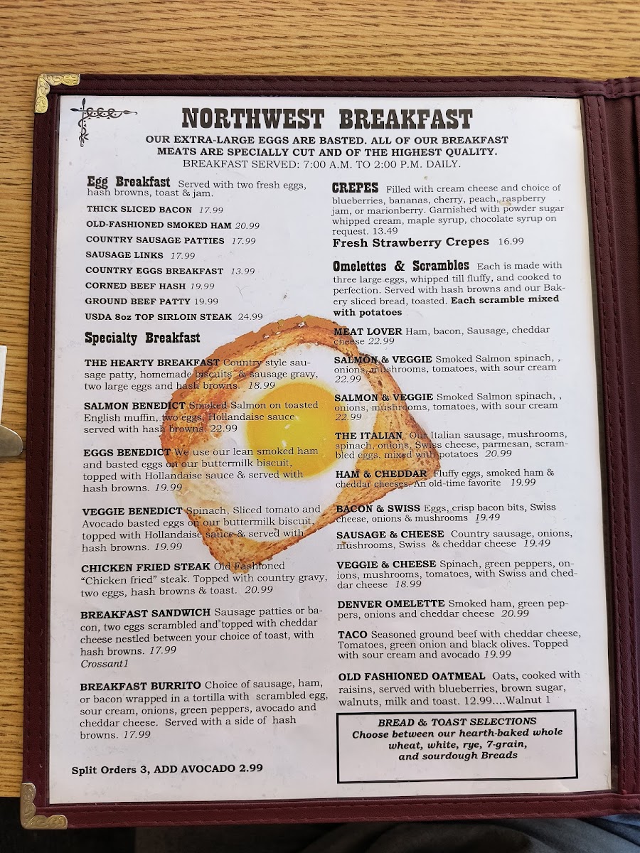 Two slices of French toast (your choice of bread) served with your choice of two strips of bacon, one country sausage patty, two sausage links, or two extra-large eggs.