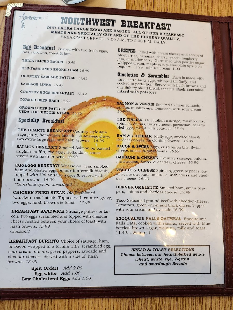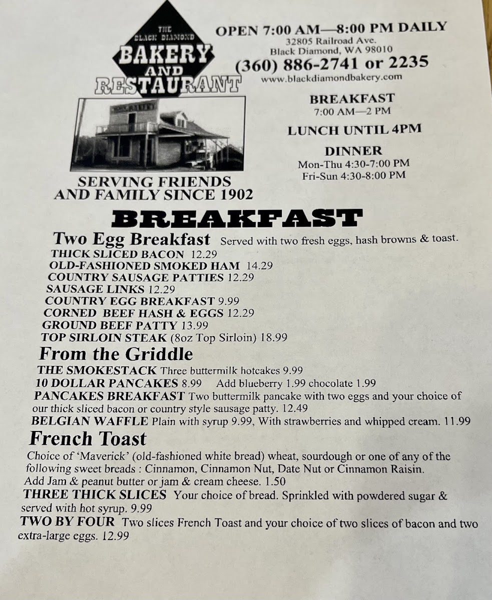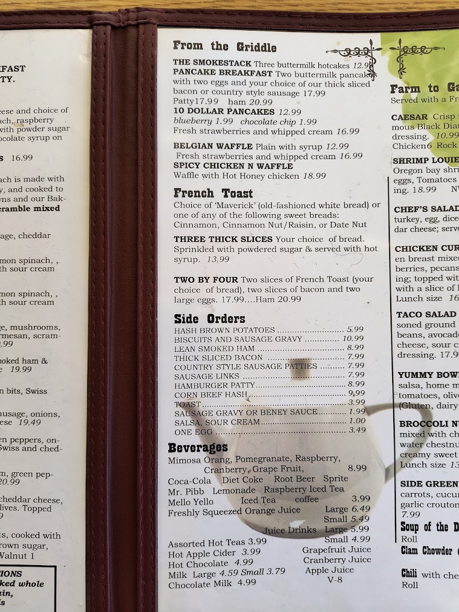 •Smokestack—Three fluffy buttermilk hotcakes. • Three-stack French toast — your choice of bread, sprinkled with powdered sugar and served with hot syrup. •Belgian waffle— plain with syrup, topped with fresh strawberries and whipped cream.